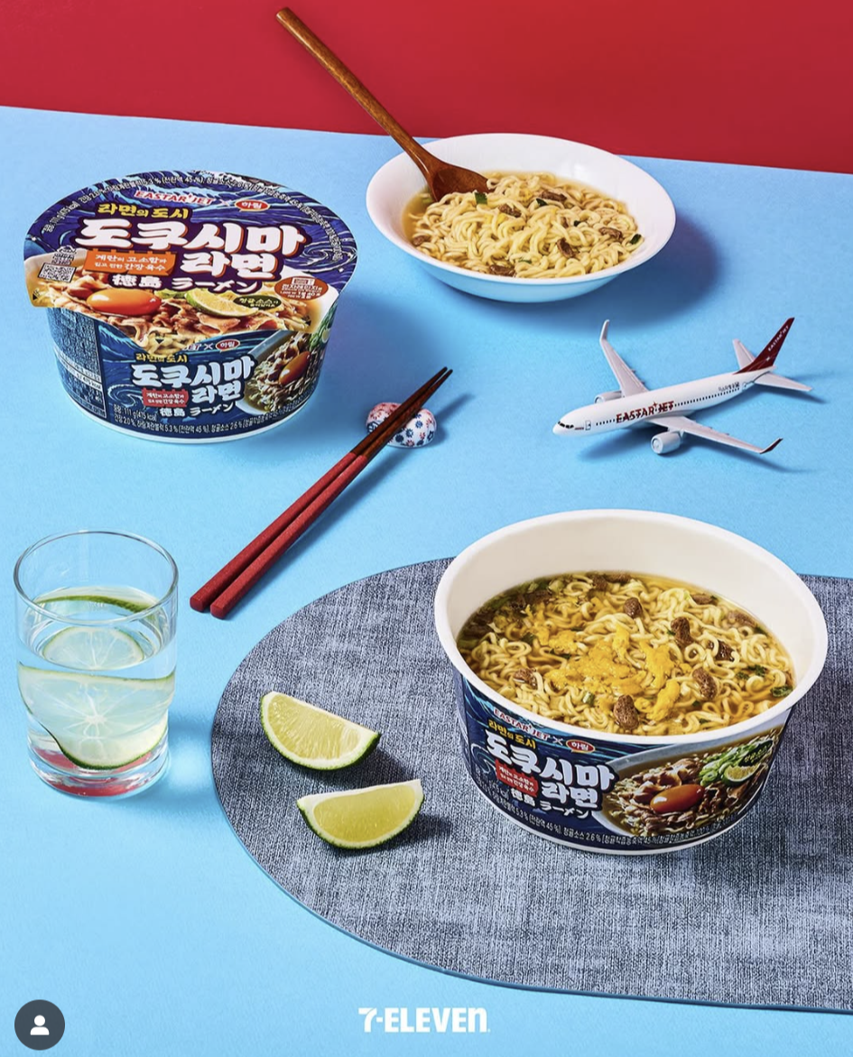 이번 도쿠시마 라면은 이스타항공, 세븐일레븐, 하림, 그리고 일본 도쿠시마현이 함께 협업해서 만든 제품이에요.